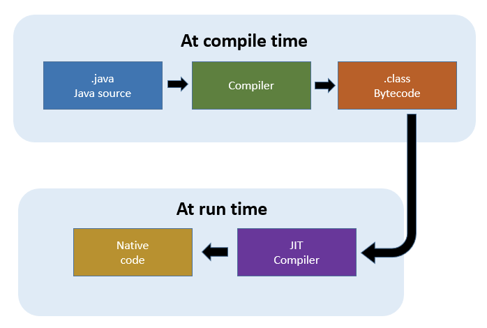 JIT 컴파일러는 런타임 시 클래스파일(바이트코드)를 네이티브 기계어로 한방에 컴파일 후 사용하는 개념으로 이해하는 것이 편하다.