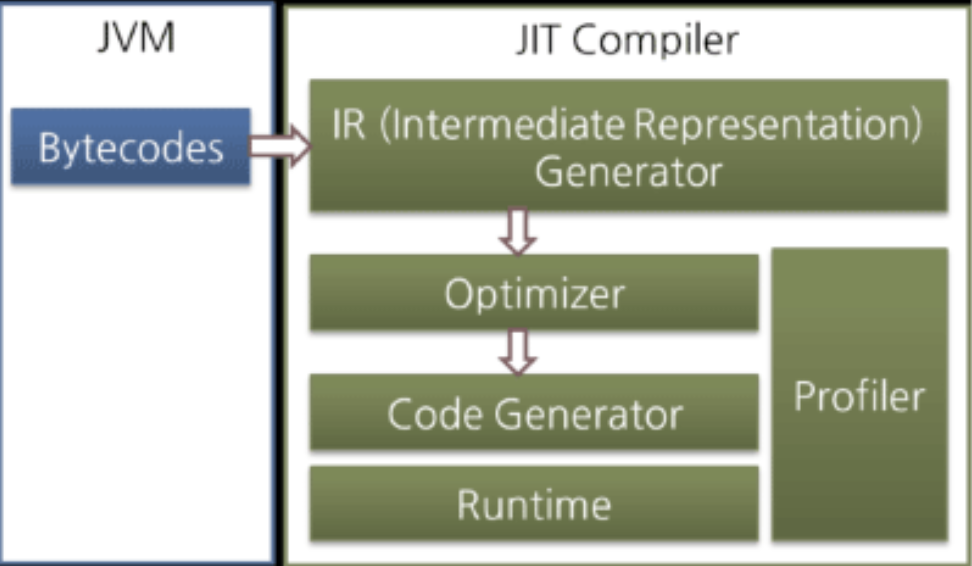 JIT 컴파일러의 내부구조는 아래와 같으며 JIT 컴파일러는 바이트코드를 일단 중간 단계의 표현인 IR(Intermediate Representation)로 변환하여 최적화를 수행하고 그 다음에 네이티브 코드를 생성한다.