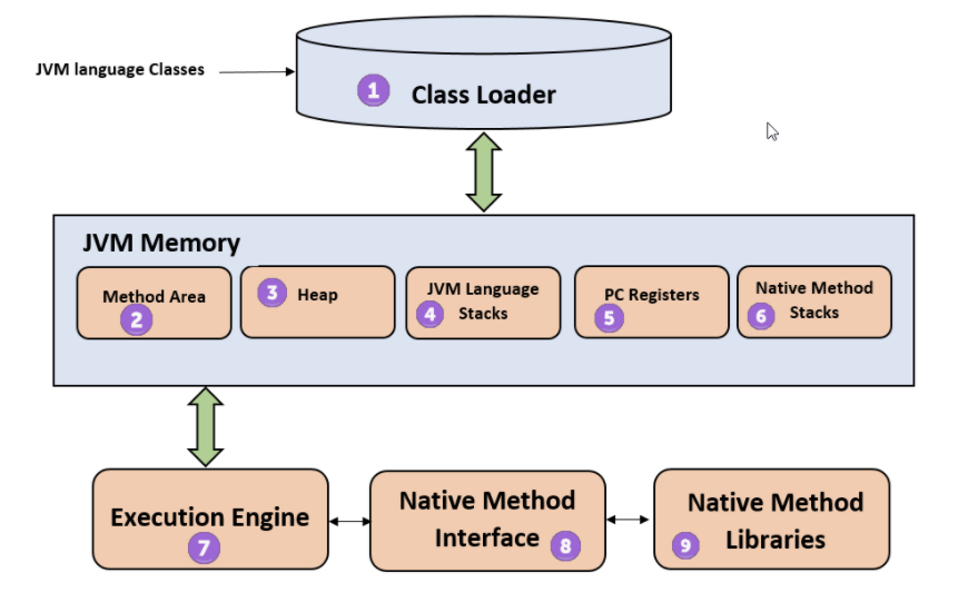 6-7. Execution Engine: 런타임 데이터 영역에 할당 된 바이트코드는 실행 엔진에 의해 실행된다.