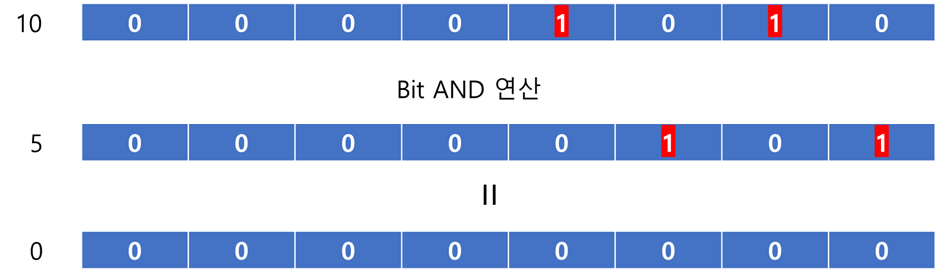 // bit AND 연산은 0 (1010 & 0101로 연산)